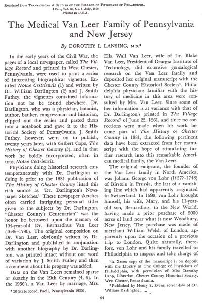 Van Leer Family of Pennsylvnia and New Jersey"--is from Transactions