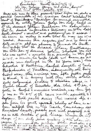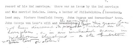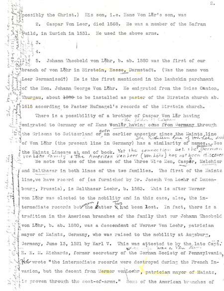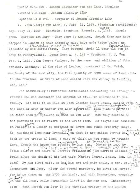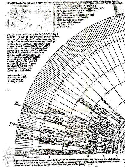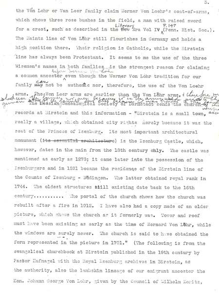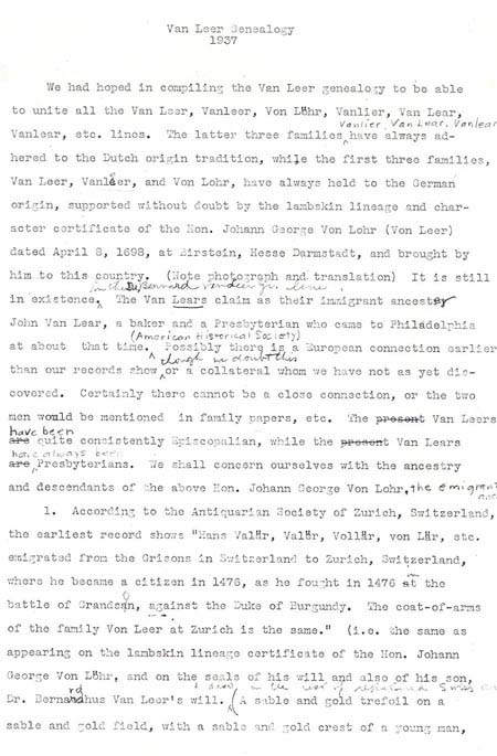 Vanleer Papers, Chester County Historical Society, Pennsylvania Mrs. Blake Van Leer did considerable research on the Van Leer family in the 1930’s. She apparently never published her work, but she left a type-written "draft" copy at the Chester County Historical Society. This document includes 3 portions of her papers: * Part 1 illustrates the Van Leer portion of a lineage "wheel." On this wheel, she gives her source for the coat-of-arms as Vol. 5 Section 4 Siebenmacher’s Wappenboch, p. 32, Table 25, published in Nurburg, in 1890. A copy is available at the Library of Congress in Washington, D.C. The "wheel" also includes a photograph (unfortunately not legible on this copy) of the lambskin lineage certificate that Johann Georg von Löhr brought with him to America. * Part 2 includes a translation of the text of Lambskin Certificate outlining German ancestors. * Part 3 includes Mrs. Van Leer’s original notes on European research.