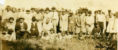 In the second row (standing), James Aden Branaman is on the far left and his wife, Anna Susan Jennings Branaman, is the second woman on the left (in the big hat behind J.W. Branhaman.) The next 3 adults are unidentified followed (left-to-right) by the teenage cousins: Archie Branaman, Elizabeth Lewis, and Nestella Branaman. Juliette Branaman Miller is to the right of Nestella. Sanford Lewis is to the right of Juliette.